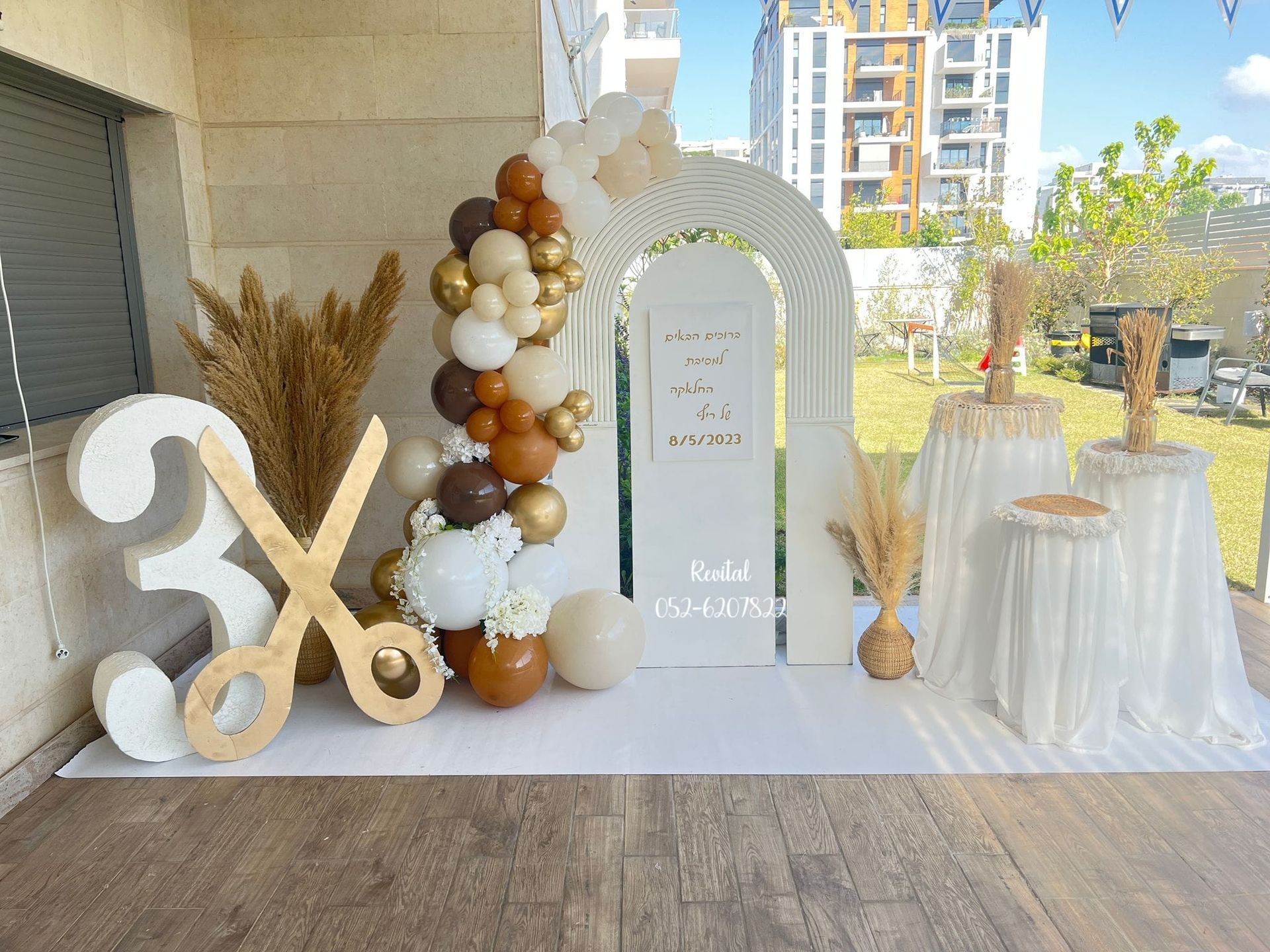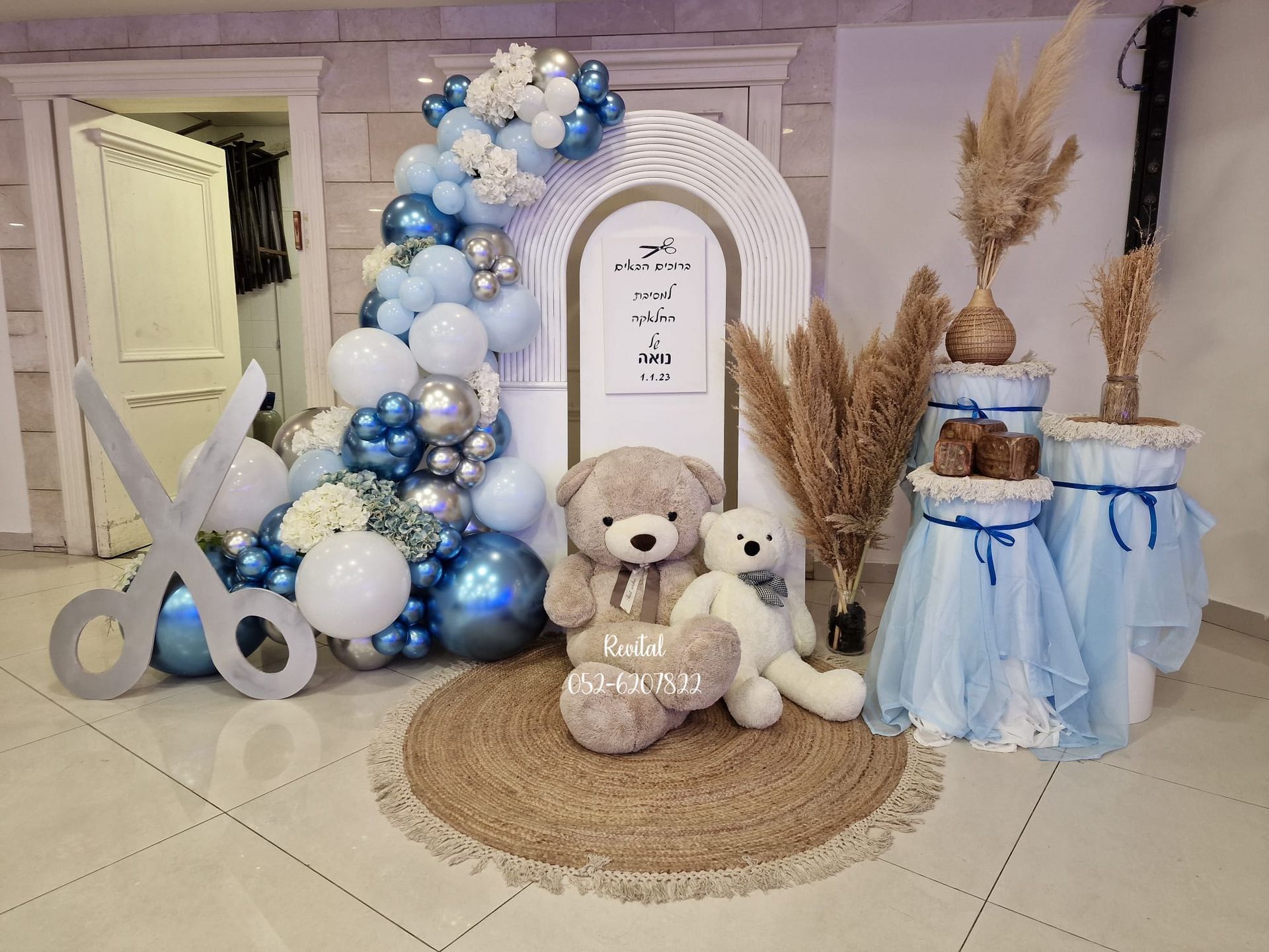 סביב אזור הטקס עצמו, חשוב ליצור מתחם מוגדר ומכובד. אפשר לעצב שער כניסה מרשים עם בדים רכים בגוונים לבנים או תכלת, שמסמל את המעבר הסמלי שהילד עובר. מסביב לכיסא המיוחד שעליו יישב הילד במהלך התספורת, אפשר לסדר עמודים נמוכים עם נרות או פמוטים מעוצבים, שיוצרים אווירה חגיגית ומיוחדת.